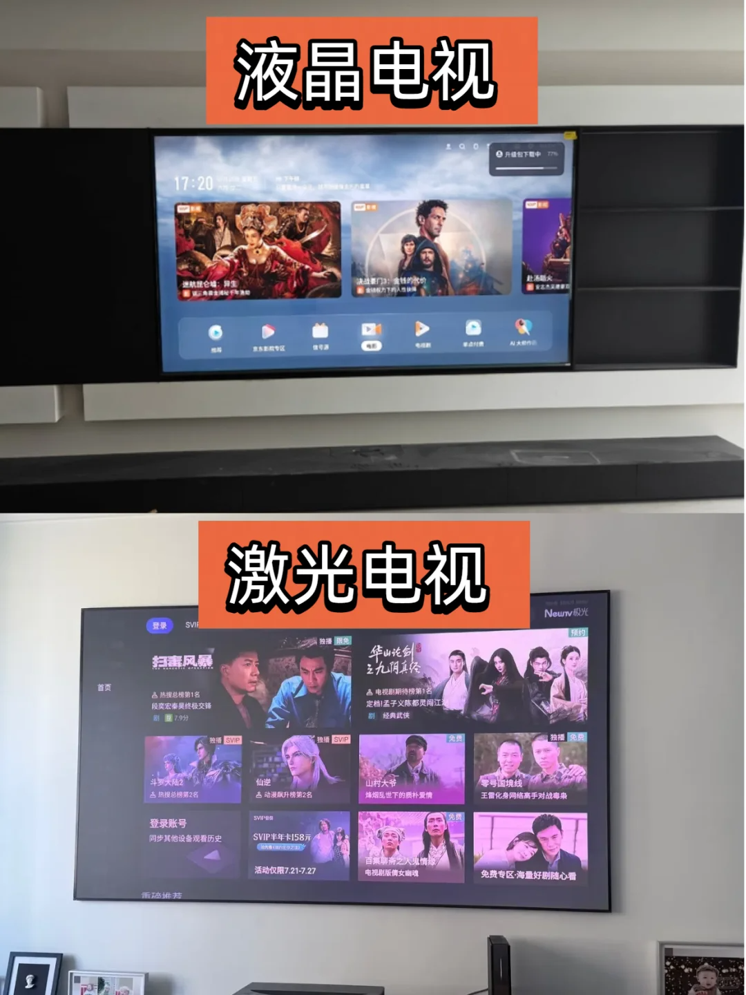 目前市面上的电视机分为液晶和激光电视机,两者相比,激光电视机屏幕更大,为此,虽然价格略高,却仍旧是很多人打造家庭影院的不二之选。